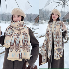 出口欧美秋冬中厚款真丝羊毛提花大方巾保暖百搭时尚披肩两用休闲
