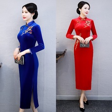丝绒旗袍2024新款秋冬款高端修身气质长款优雅改良复古日常连衣裙