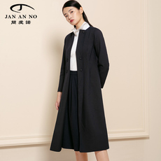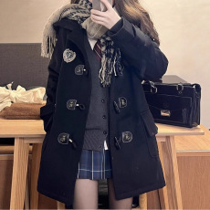 日系学院风牛角扣大衣外套女2025年秋冬季黑色中长款百搭毛呢外套