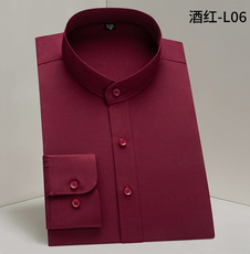 2025秋季新款立领衬衫男长袖商务休闲职业装无口袋圆领酒红色衬衣
