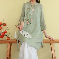 新中式苎麻斜襟立领衬衫女25夏新款国风宽松显瘦刺绣改良旗袍上衣