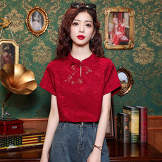 重工刺绣棉麻衬衫2024夏季新款民族风女装立领改良式旗袍短袖上衣