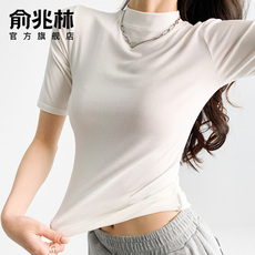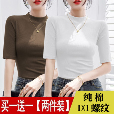 夏季精梳纯棉七分袖T恤女半高立领宽松大码丝光棉半袖上衣打底衫