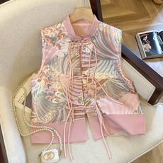 醋酸缎面打底背心女夏季气质木耳边上衣T恤立领法式印花无袖衬衫