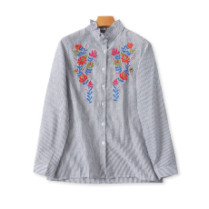 外贸出口原单新中式刺绣条纹七分袖衬衫女夏季复古国风立领上衣潮