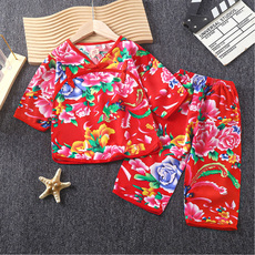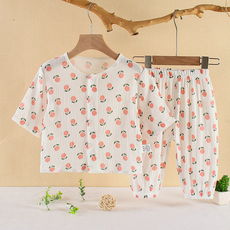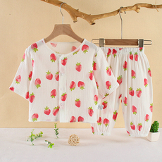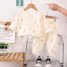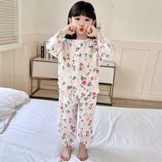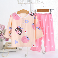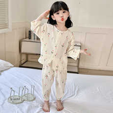 儿童薄款开衫印花睡衣七分袖宝宝夏季女童套装双层纯棉纱布空调服