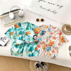 儿童双层棉纱七分袖开衫印花睡衣家居服夏季薄款洋气帅气男女套装