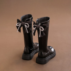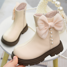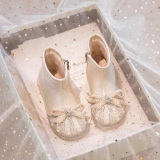 女童蝴蝶结真皮公主靴儿童短靴2025春秋款童鞋加绒二棉靴女孩单靴