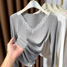 灰色V领蕾丝花边竹节棉长袖T恤女高级纯欲低领打底衫褶皱收腰上衣