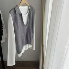 k7906浅灰色翻领针织马甲加竹节棉长袖白T恤两件套女2025秋冬