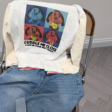 2025春秋日系男女儿童条纹拼接四宫格狗狗数码印花竹节棉长袖T恤