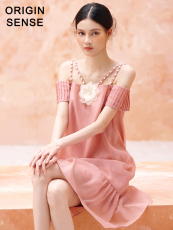 减龄公主粉色露肩珍珠装饰吊带性感直筒版型遮肚子短袖超短连衣裙