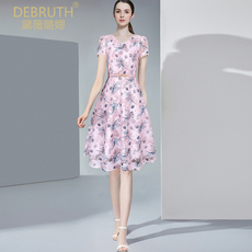 艾丽丝2025夏季新款超仙刺绣蕾丝中长款连衣裙甜美粉色印花公主裙