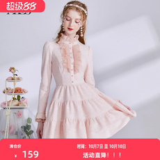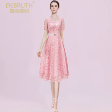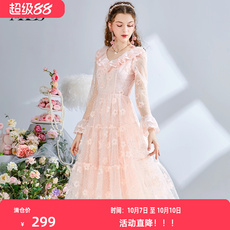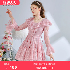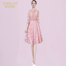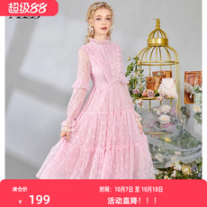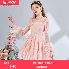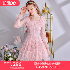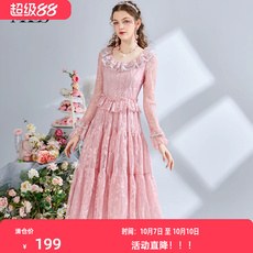 黛薇璐媤粉色花边蕾丝公主连衣裙女中长春秋新款法式气质收腰A裙