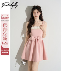 艾丽丝2025年夏季新款粉色甜美公主裙方领珍珠蝴蝶结短款连衣裙女