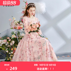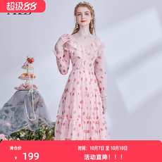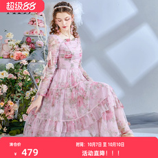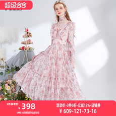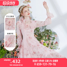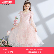 艾丽丝2025秋季新款粉色甜美仙气公主裙长袖网纱碎花中长款连衣裙