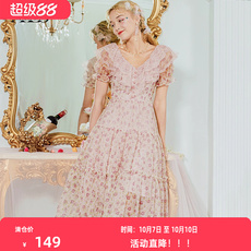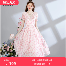 艾丽丝超仙气质连衣裙2025夏季新款V领荷叶边粉色甜美印花公主裙