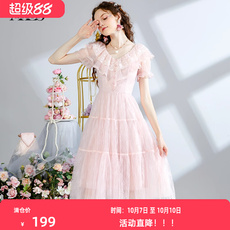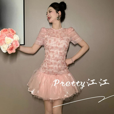 重工刺绣荷叶边粉色网纱连衣裙女甜美公主风超仙气质圆领短裙夏季