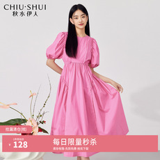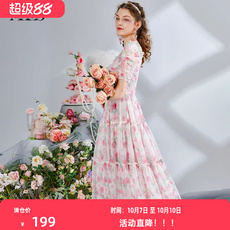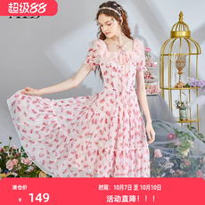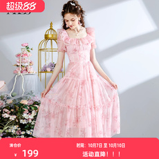 唐狮粉色泡泡袖连衣裙女夏新款长裙小个子公主裙甜美裙子女夏季q3