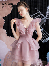 小众设计V领蝴蝶袖欧根纱粉色公主蓬蓬裙超短小个子晚礼服连衣裙