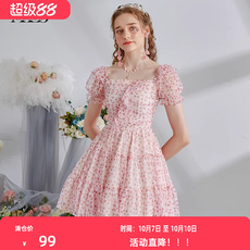 KEIKO 仙灵小碎花欧根纱连衣裙夏季温柔淡粉色A字蓬蓬公主裙短裙