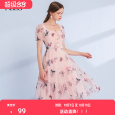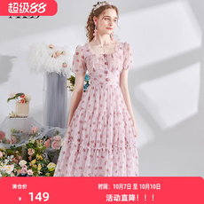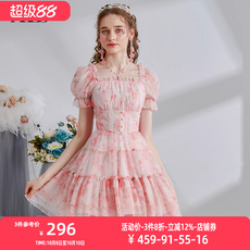艾丽丝2025夏季新款甜美减龄超仙公主裙粉色网纱印花方领连衣裙女
