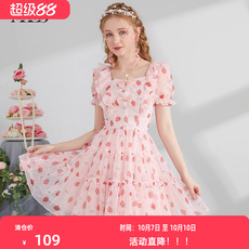 艾丽丝2025夏季新款粉色甜美公主风连衣裙女短袖方领草莓印花短裙