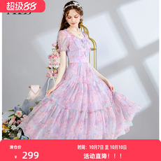 美妃2023春夏法式仙女女神公主范时尚气质新款粉色花网纱连衣裙装