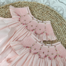 夏季女童手工打揽花朵刺绣连衣裙粉色飞袖棉薄款女宝宝可爱公主裙