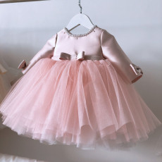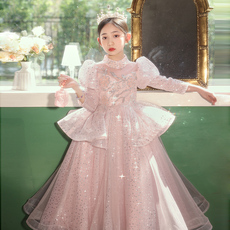 粉色公主裙女童蓬蓬纱长袖儿童小主持人钢琴演出服花童礼服女秋季