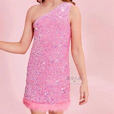 定制儿童礼服女带披风短款公主裙蓬蓬走秀演出摄影宴会粉色鸵鸟毛