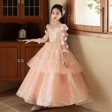 儿童粉色礼服公主l裙女童生日小花童婚纱主持人钢琴演出服演奏秋