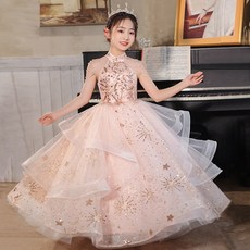 儿童晚礼服女童公主裙粉色花童小女孩挂脖主持人钢琴演出服夏