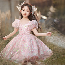 女童礼服儿童主持人钢琴演出服粉色女孩生日公主裙蓬蓬纱夏季