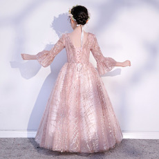 粉色儿童礼服公主裙女童生日w长袖走秀小花童主持人钢琴演出服长