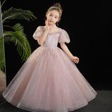 女童粉色泡泡袖晚礼服高端儿童蓬蓬公主长裙花童婚纱裙钢琴演出服