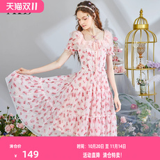 浪漫主义~法式在逃公主泡泡袖绝美碎花蓬蓬连衣裙 粉色收腰娃娃裙