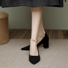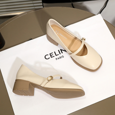 4cm高粗跟中跟方头软底单鞋女2025新款春季方扣百搭软皮高跟鞋女