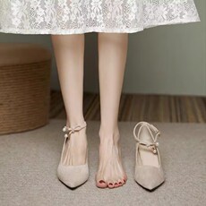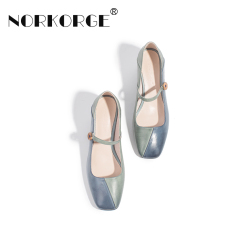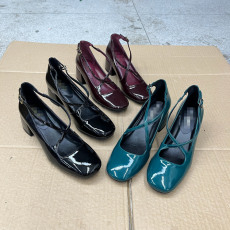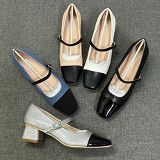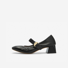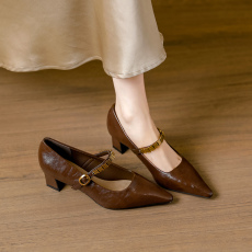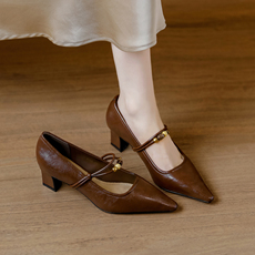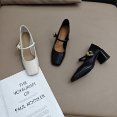 外贸原单时尚欧美鞋垫真皮交叉一字扣方头粗跟中跟单鞋通勤玛丽珍