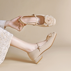 玛丽珍鞋女中跟2025秋季温柔晚晚风花朵女鞋法式粗跟方头浅口单鞋