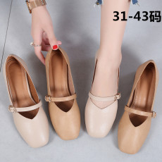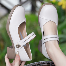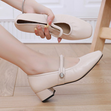 羊皮玛丽珍女鞋春夏粗跟浅口单鞋软底舒适妈妈鞋中跟大码方头皮鞋