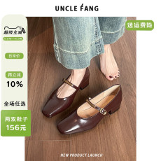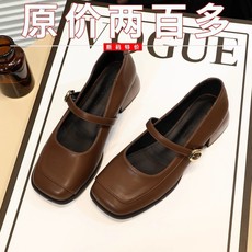 舒适软皮法式一字带玛丽珍鞋女粗跟复古风咖色中跟小皮鞋方头单鞋