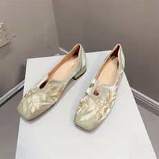新中式绣花鞋粗跟中跟豆豆鞋女2025新款复古刺绣单鞋女软底奶奶鞋