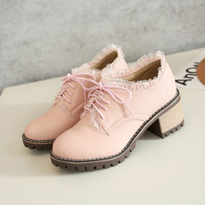 2025春新款蕾丝边粗跟女鞋子甜美学生系带圆头中跟大码布洛克单鞋