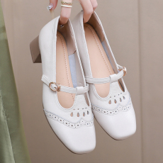 真皮方头编织镂空玛丽珍鞋女2025新款中跟一字带单鞋粗跟包头凉鞋