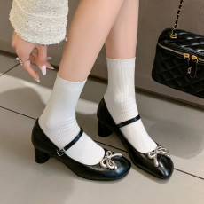 春新款小码女鞋313233方头中跟粗跟软皮蝴蝶结一字扣玛丽珍女单鞋
