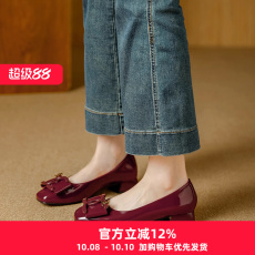 漆皮蝴蝶结方头单鞋女秋新款女鞋百搭浅口软皮粗跟酒红色中跟鞋
