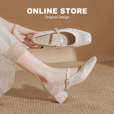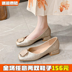 国风新中式绸缎单鞋女配旗袍汉服粗跟不累脚中跟婚纱伴娘鞋新娘鞋