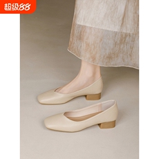 羊皮版~方头裸色单鞋女秋粗跟浅口中跟不累脚瓢鞋大码女鞋41到43