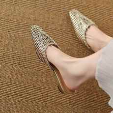 法式复古编织镂空包头半拖鞋女夏外穿小粗跟方头穆勒鞋欧货凉拖鞋